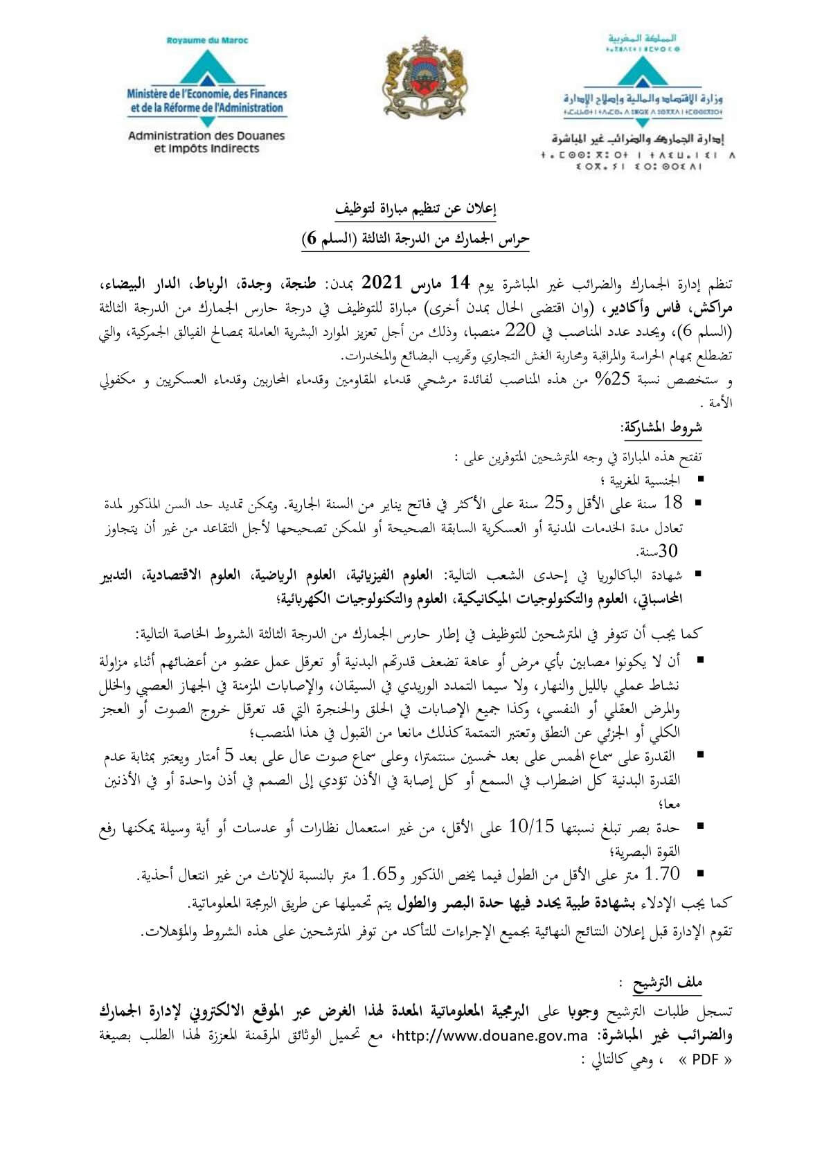 تنظم إدارة الجمارك والضرائب غير المباشرة يوم 14 مارس 2021 بمدن: طنجة، وجدة، الرباط، الدارالبيضاء، مراكش، فاس وأكادير، (وإن اقتضى الحال بمدن أخرى) مباراة للتوظيف في درجة حارس الجمارك من الدرجة الثالثة (السلم 6)، ويحدد عدد المناصب في 220 منصبا، وذلك من أجل تعزيز الموارد البشرية العاملة بمصالح الفيالق الجمركية، والتي تضطلع بمهام الحراسة والمراقبة ومحاربة الغش التجاري وتهريب البضائع والمخدرات.
