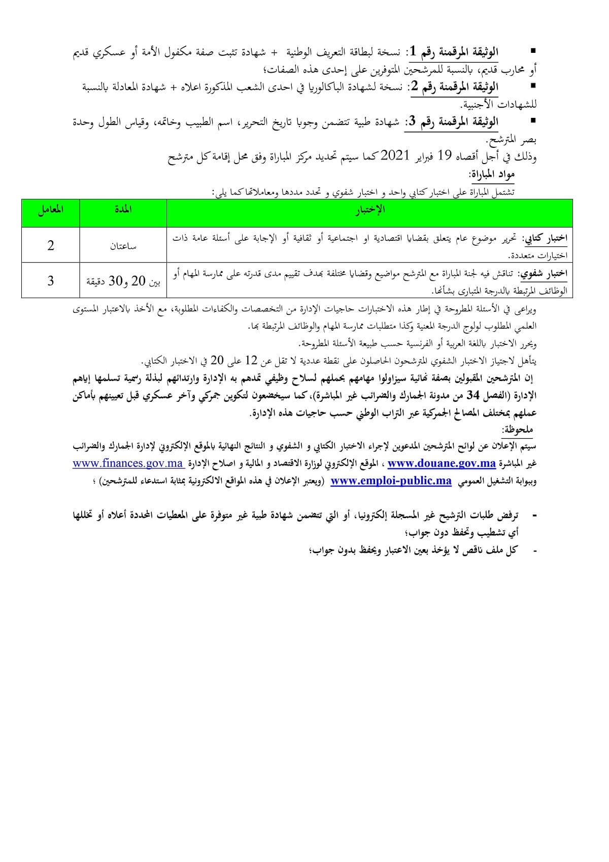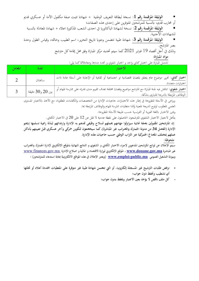 – سيتم الإعلان عن لوائح المترشحين المدعوين لإجراء الاختبار الكتابي والشفوي والنتائج النهائية بالموقع الإلكتروني لإدارة الجمارك والضرائب غير المباشرة www.douane.gov.ma؛ الموقع الإلكتروني لوزارة الإقتصاد والمالية وإصلاح الإدارة www.finances.gov.ma وببوابة التشغيل العمومي www.emploi-public.ma (ويعتبر الإعلان في هذه المواقع الإلكترونية بمثابة استدعاء للمترشحين)؛