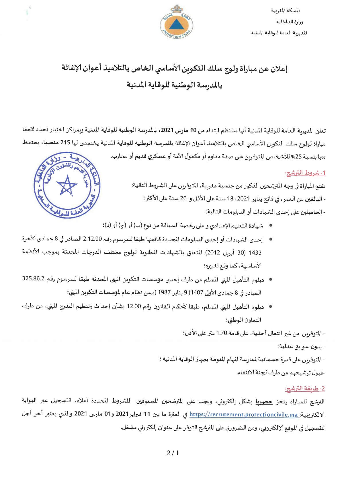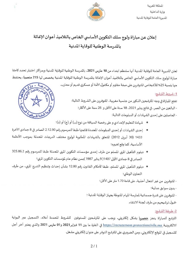 تعلن المديرية العامة للوقاية المدنية أنها ستنظم ابتداء من 10 مارس 2021، بالمدرسة الوطنية للوقاية المدنية وبمراكز اختبار تحدد لاحقا مباراة لولوج سلك التكوين الأساسي الخاص بالتلاميذ أعوان الإغاثة بالمدرسة الوطنية للوقاية المدنية يخصص لها 215 منصبا، يحتفظ منها بنسبة 25% للأشخاص المتوفرين على صفة مقاوم أو مكفول الأمة أو عسكري قديم أو محارب.