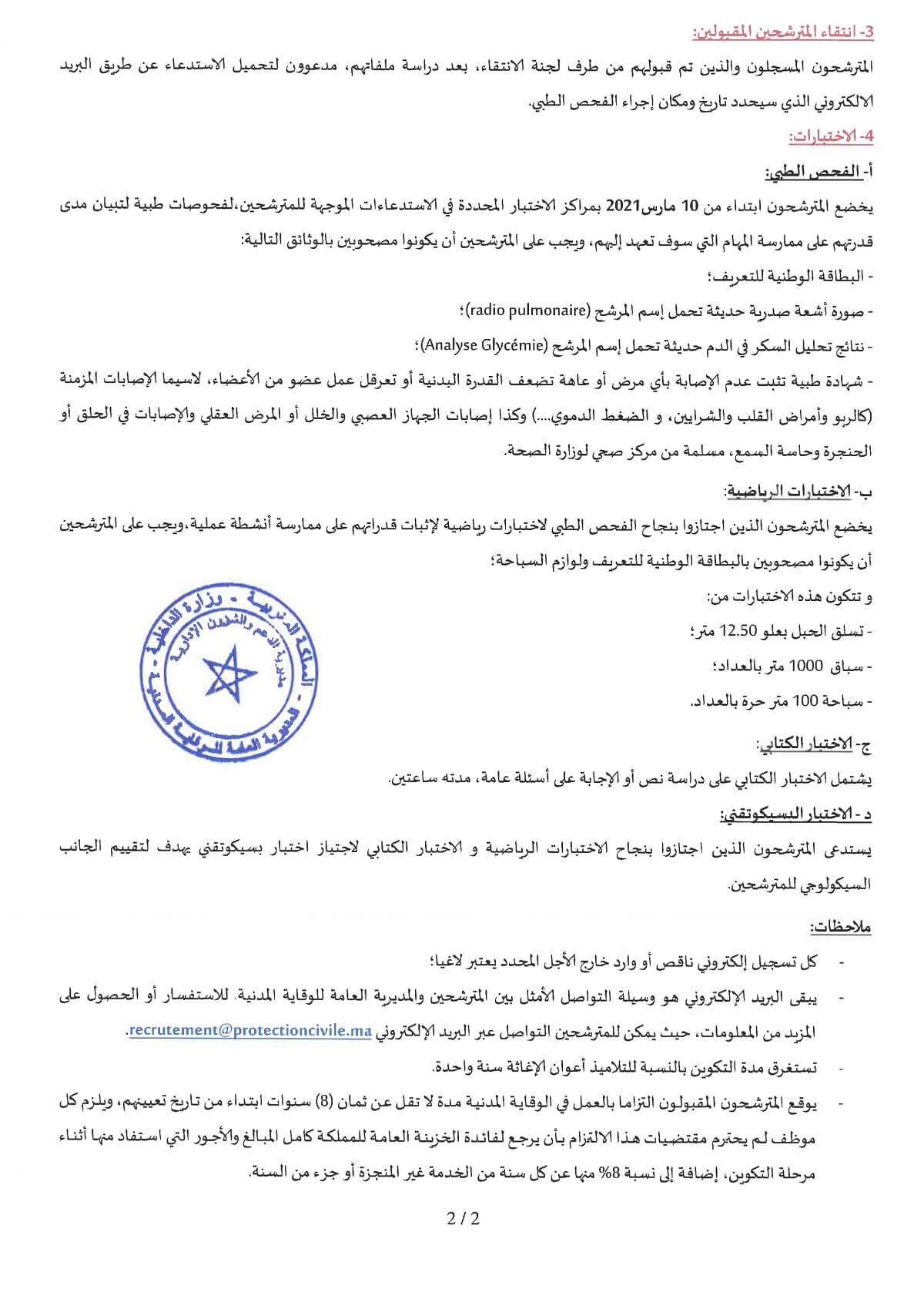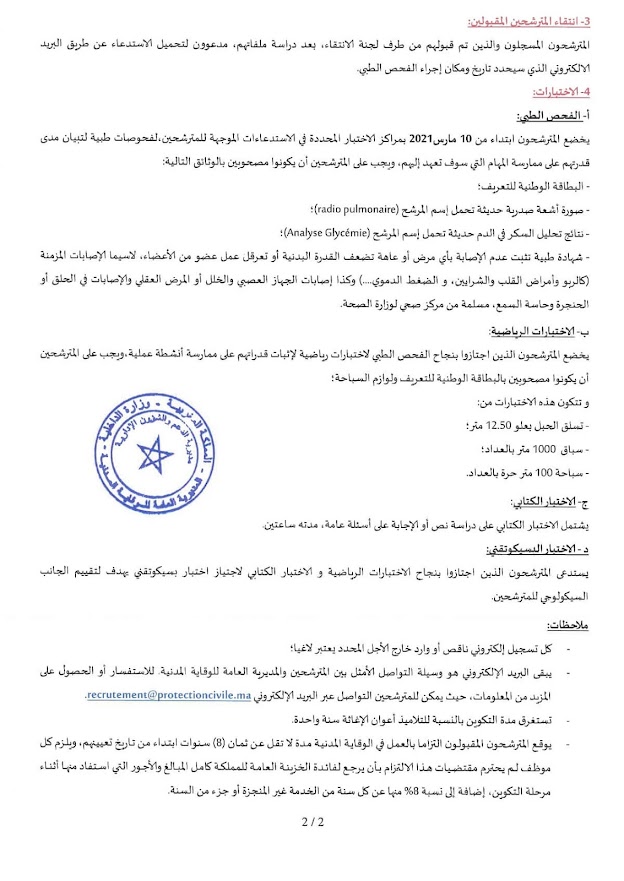يخضع المترشحون ابتداء من 10 مارس 2021 بمراكز الاختبار المحددة في الاستدعاءات الموجهة للمترشحين، لفحوصات طبية لتبيان مدى قدرتهم على ممارسة المهام التي سوف تعهد إليهم، ويجب على المترشحين أن يكونوا مصحوبين بالوثائق التالية: