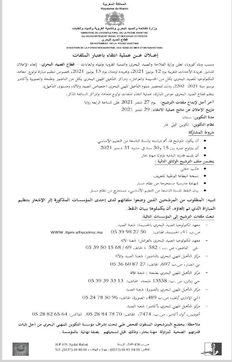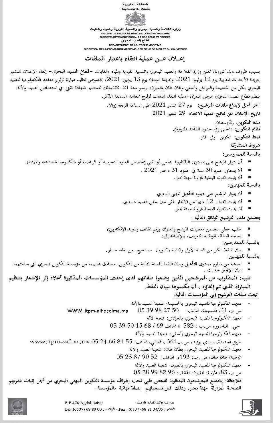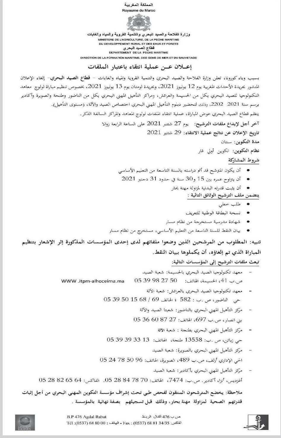 Le Ministère de l’Agriculture, de la Pêche Maritime du Développement Rural et des Eaux et Forêts -Département de la Pêche Maritime- organise au titre de l’année 2021-2022 un concours d’accès aux Instituts de Technologie des Pêches Maritimes (ITPM) d’AI Hoceima, de Larache, de Safi, de Tan-Tan et de Lâayoune.